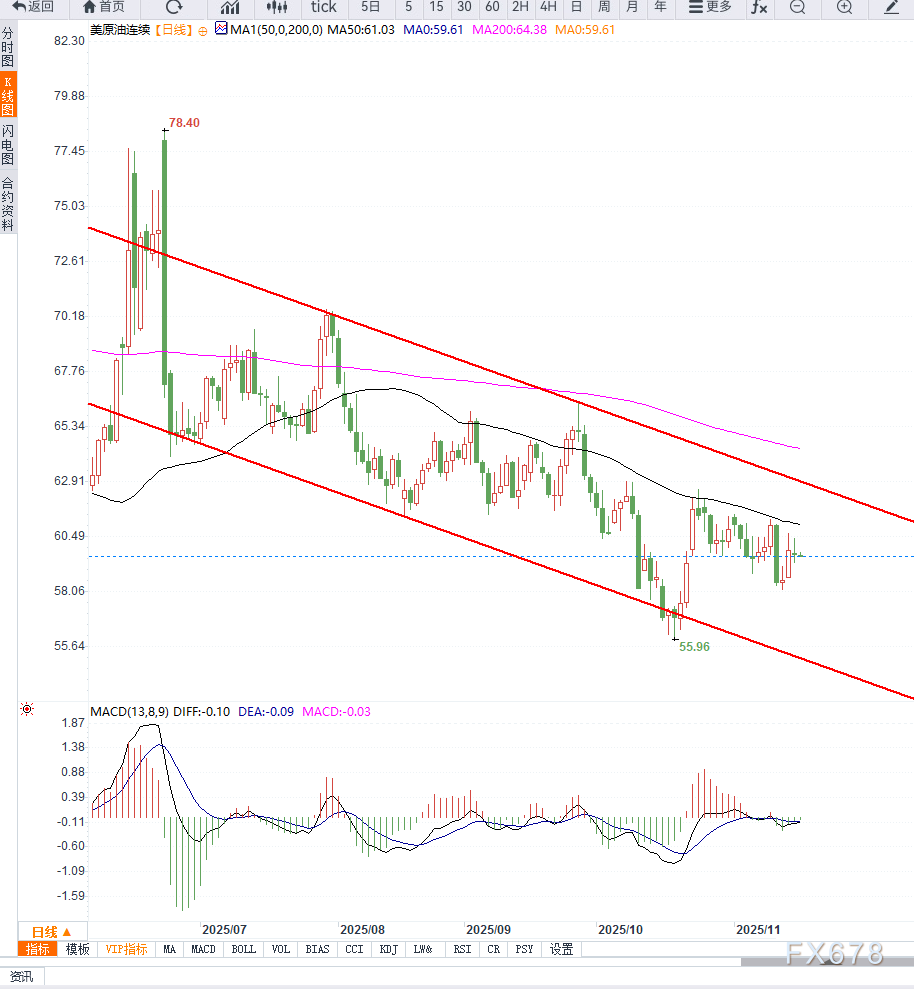 从日线结构来看,美原油(WTI)整体保持弱势震荡格局。价格运行在主要均线下方,趋势性压力较为明显。日线K线连续在60美元附近拉出小实体波动,显示多空力量均未占据绝对优势。