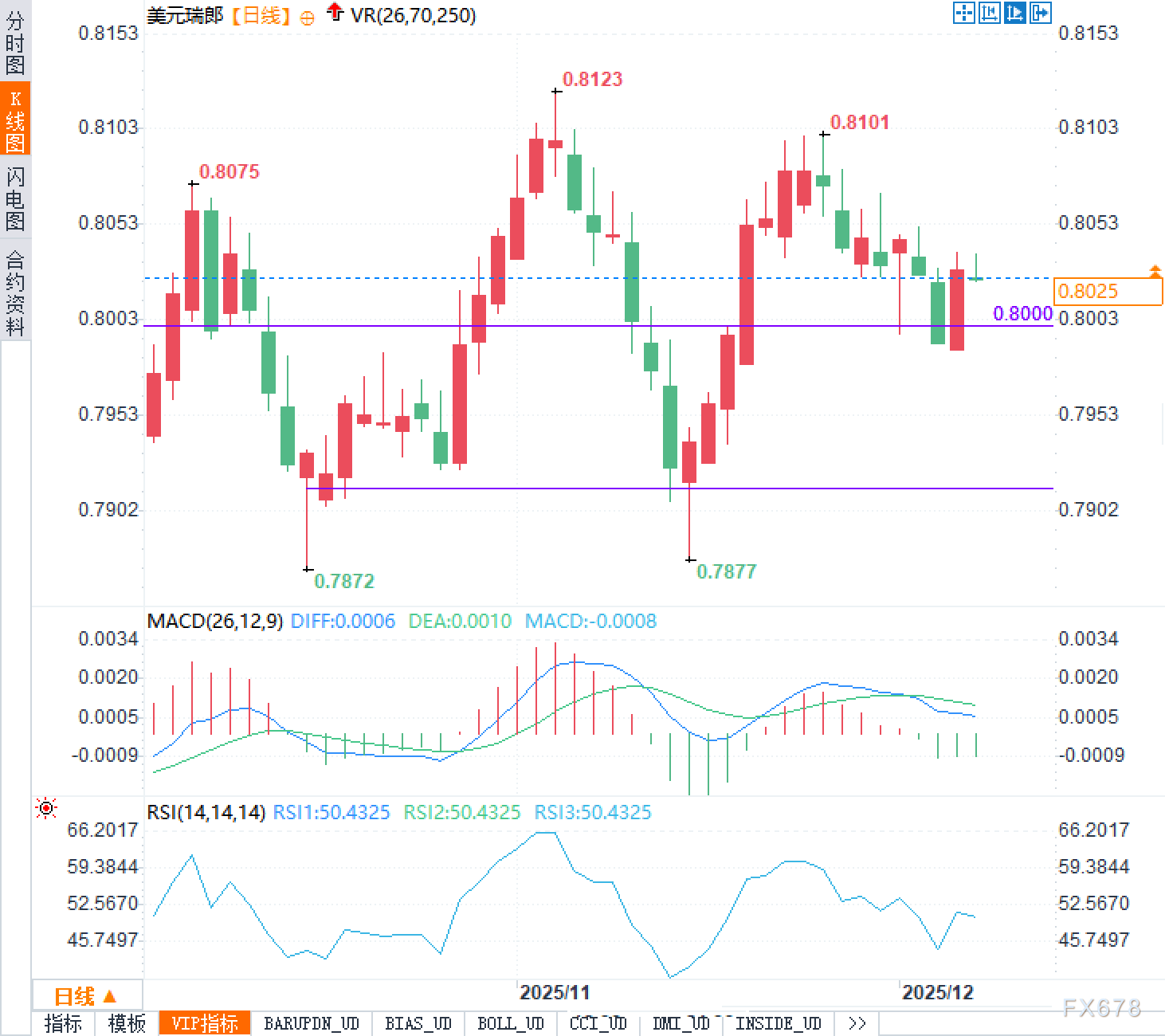 中期来看,美联储货币政策路径与主席人选的不确定性仍是主导汇价走向的核心变量。若哈塞特最终接任美联储主席并推动更激进的降息步伐,美元可能面临持续性贬值压力,美元兑瑞郎不排除下探0.7800一线的可能。然而,瑞士央行同样面临低通胀困境,若其在12月议息会议上释放更强的鸽派信号甚至超预期降息,瑞郎走强的势头将受到抑制,汇价存在企稳反弹的空间。