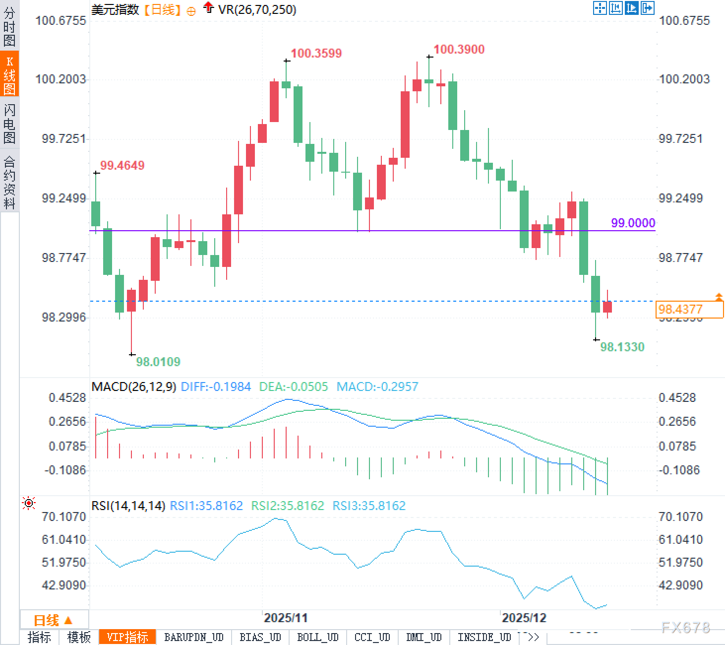 从日线结构看,美元指数在两次上冲100.36/100.39附近未能延续,形成阶段性双顶后回落,近期跌破并持续运行在99.0000一线下方,重心下移明显;当前报98.40附近,已接近前低98.1330附近的支撑带。动能指标方面,MACD处于零轴下方且DIFF(-0.1984)低于DEA(-0.0505),柱体继续走弱,显示下行惯性仍占主导。RSI约35.8,处于偏弱区间,短线存在“超卖化”特征,但在趋势未扭转前,反弹的持续性仍需更多信号验证。上方关注98.80与99.00附近的压力区,下方关注98.13/98.00的支撑有效性。