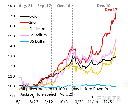 贵金属涨势再度抬头。自鲍威尔主席8月22日在杰克逊霍尔发表鸽派讲话以来,白银涨幅已约75%。